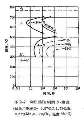 從圖中3種淬火液的冷卻特性對(duì)比分析,雖然最大冷速差不多為140~160℃/秒,冷卻速度介于水油之間。對(duì)應(yīng)于60Si2Mn的S-曲線看,650℃冷卻速度太慢,發(fā)生鐵素體析出,400℃的冷速太慢,有較多的貝氏體組織形成,達(dá)不到淬火所要求的硬度。
