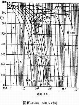 從圖中50CrV鋼的連續(xù)冷卻轉(zhuǎn)變曲線圖分析,若得到完全馬氏體組織,在整個(gè)冷卻過(guò)程中,在400-500℃的范圍,要求冷速達(dá)到一定值,速率剛好大于等于臨界點(diǎn),不和S曲線的鼻尖處相交。在此處冷速越慢,非馬氏體組織和貝氏體組織形成的越多,馬氏體組織越少。