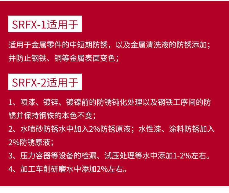 SRFX-2:本品主要原料為植物中提取,金屬零件工序間的防銹,用量少,1-2% 原液兌水即可防銹,濃度越大防銹時間越長,濃度推薦,短期防銹:1%-10%原液