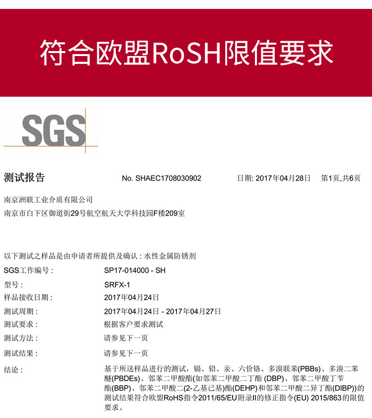 防銹劑清澈透明,無油污,易清洗。綠色環保,不含鋅、醛、重金屬、亞硝酸鈉、酚等對人體和環境有害的物質,產品符合歐盟 RoHS 限值要求;對皮膚無刺激性;夏季使用不霉變、不發臭;本品可以長期保存,無沉淀、無分層、無結晶物析出。本品在金屬表面形成一層覆蓋均勻的防銹鈍化膜,這層膜使鋼鐵表面與外界環境隔離開,起到防止銹蝕的作用。